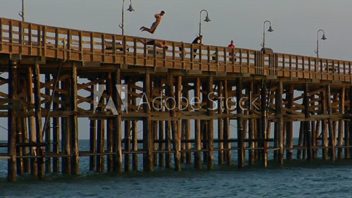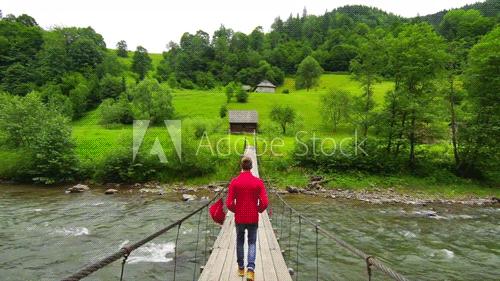 A Young Man Tourist Walk Across a Suspension Bridge over