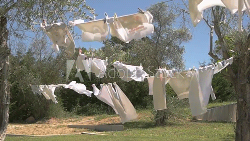 Clothes in the wind. Grass, trees and sky. New washing powde