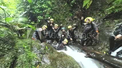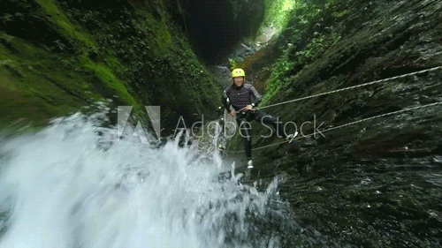 Tourist Descending Large Waterfall, Canyoning Activity Banos